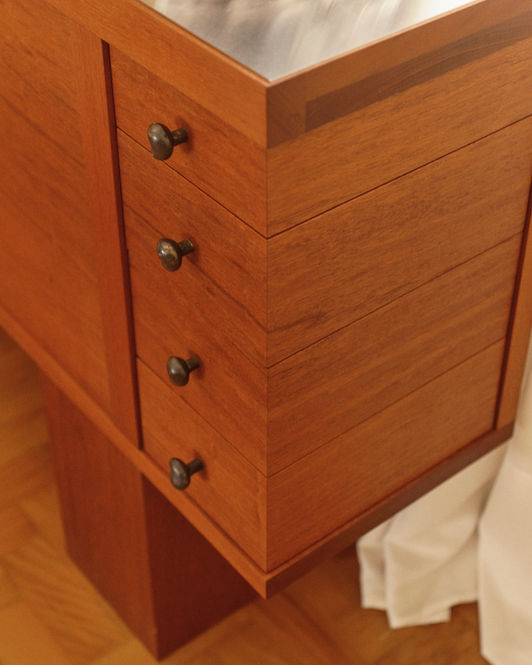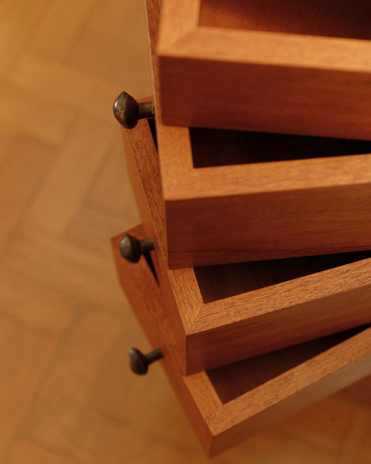 Mogno, inox, e puxadores esculturais em latão fundido.